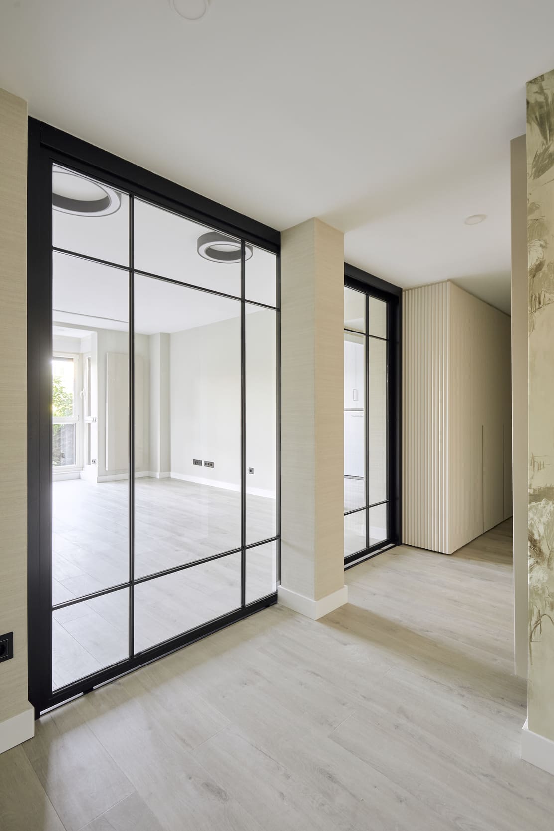 Se eliminaron tabiques innecesarios para potenciar la sensación de amplitud y continuidad visual. Para ello diseñamos una puerta corredera en cerrajería y cristal para poder dar intimidad en los momentos necesarios. - Se reubicaron las estancias privadas (dormitorios y baños) para optimizar el uso de metros cuadrados y mejorar la orientación respecto a la luz natural y el uso que íbamos a dar a los nuevos espacios.