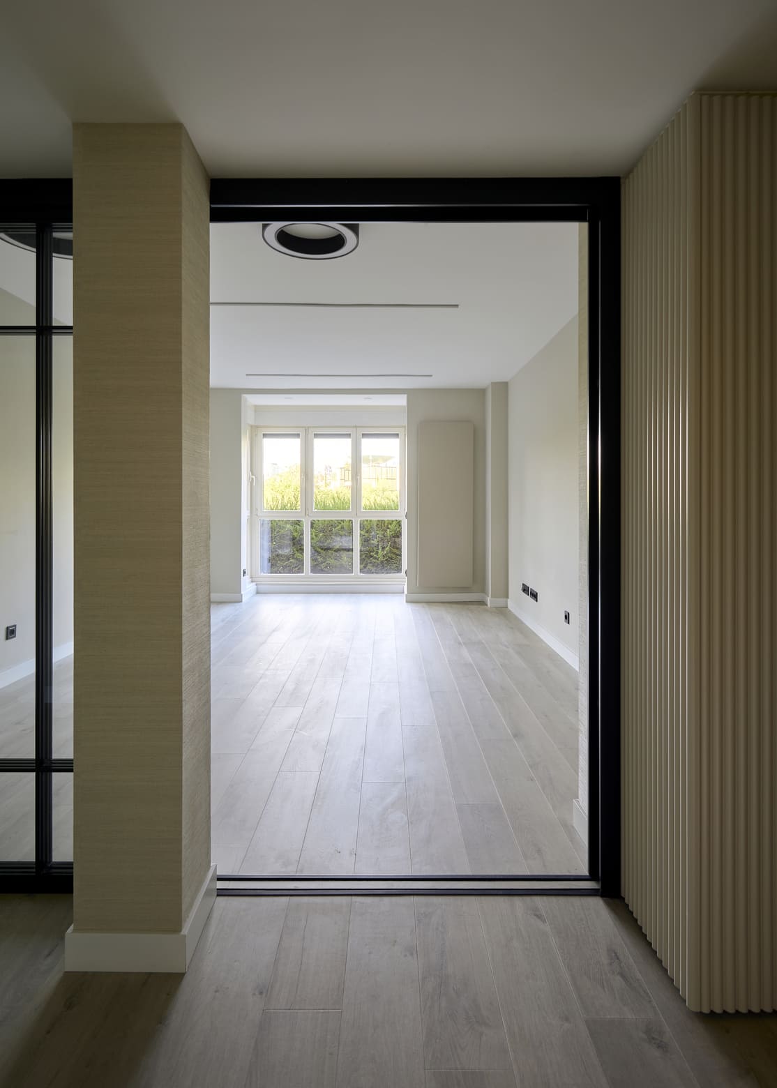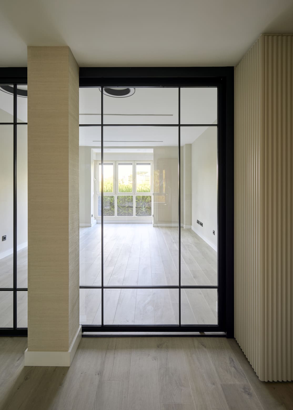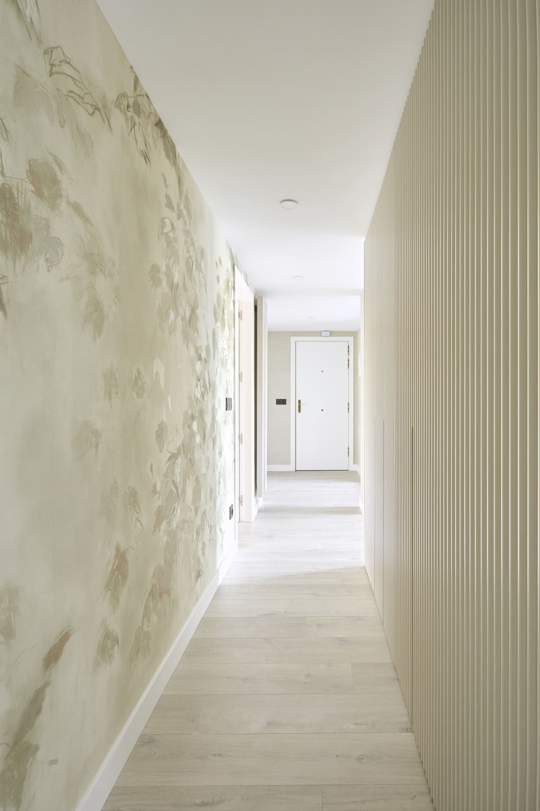- Se eligieron tonos claros, papeles pintados suaves, acabados mate y carpintería interior en blanco lo que ayudó a maximizar la luminosidad natural durante todo el día.